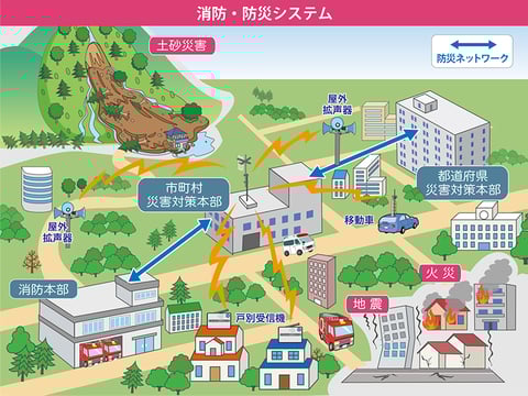 火災や地震や土砂崩れなど災害が発生した際に、素早く的確に情報を伝達するシステムを構築しています。