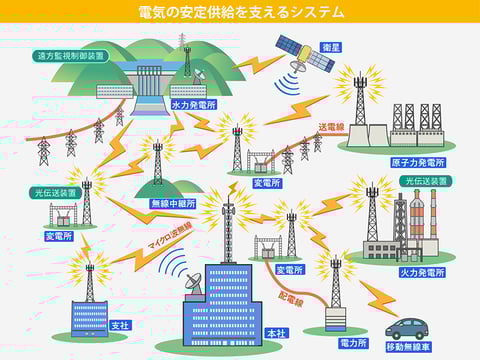 電気を安定供給するために、電力設備の運転状況や事故情報を的確に素早く伝えるための伝送路などの構築・保守サポートを行っています。
